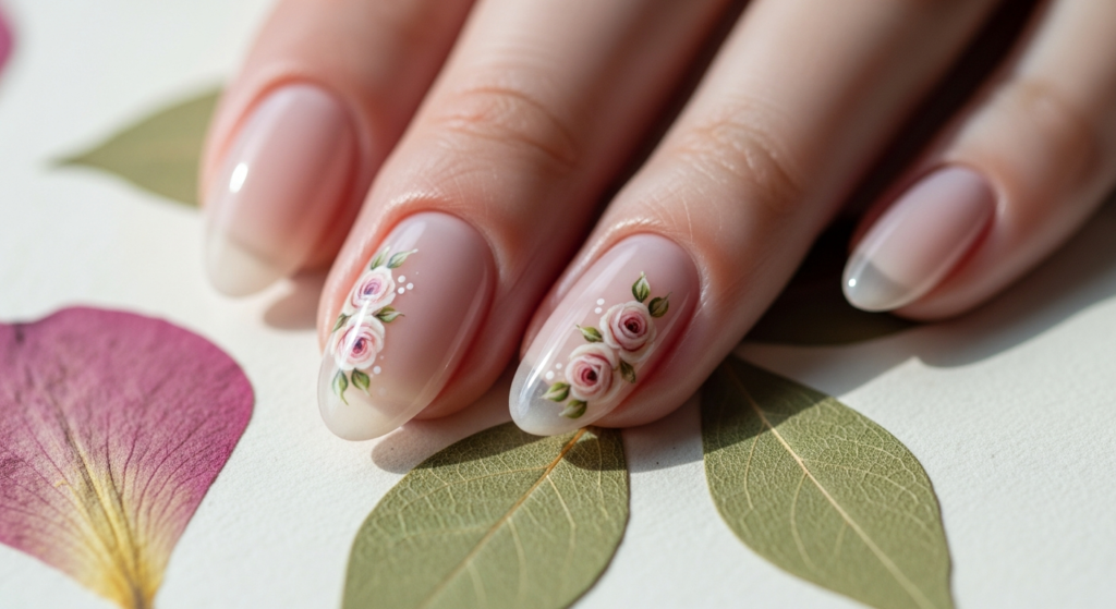 The 2025 micro floral gel nail features: hand-painted roses no larger than 4–5mm in diameter, pressed and encapsulated dried botanicals under a glass-finish gel, watercolor-style florals with soft edges and botanical color palettes, or single sprig illustrations in a simple yet expertly executed line-art style.