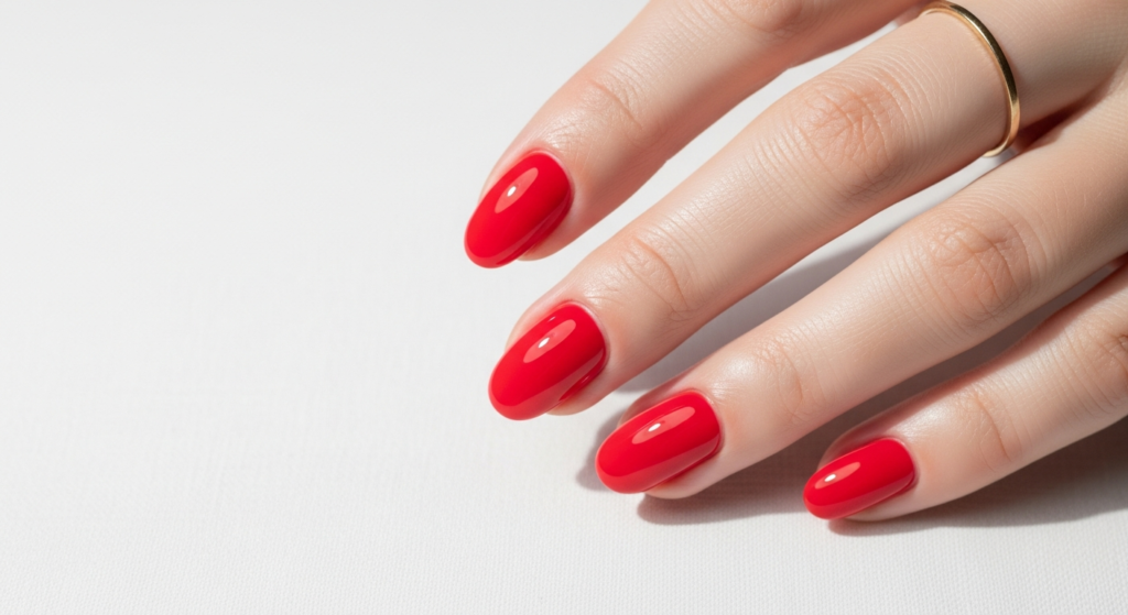A true cherry red in gel formula — a pure, neither orange-leaning nor blue-toned cherry — applied in a high-gloss cream finish achieves something remarkable: it makes every hand look more elegant, more alive, and more memorable. This is not a color that requires nail art or embellishment. The color itself is the statement.