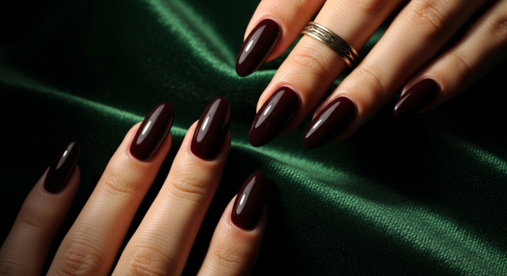 Styling tip: Dark berry and plum gel nails are at their most glamorous against tactile, rich fabrics — velvet, silk, cashmere, suede. The color reads as particularly extraordinary alongside a rich caramel cashmere or a cream silk blouse. For jewelry, warm metallic tones — gold, bronze, antique brass — complement the plum’s warm-cool balance far more beautifully than silver or platinum.