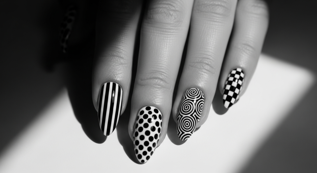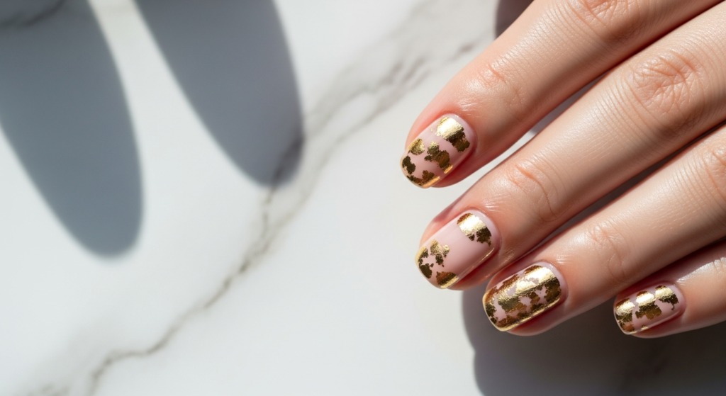 Use metallic foils or thin lines as accents rather than full coverage. Pair with neutral bases for contrast and elegance.