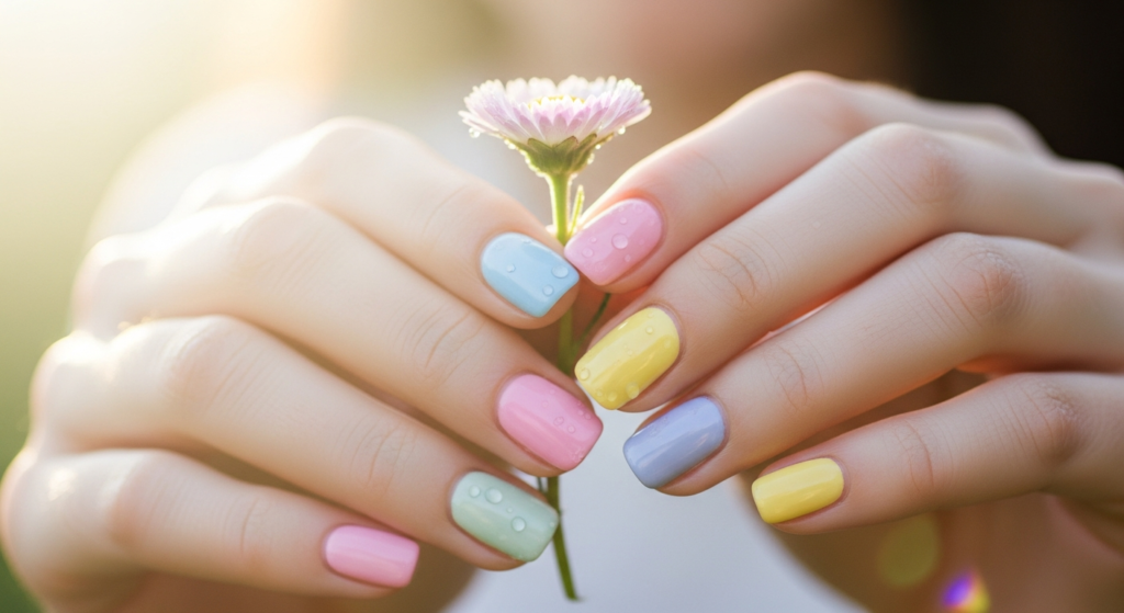 Alternate colors on each nail or create subtle gradients. These tones pair beautifully with light fabrics and spring-inspired wardrobes.