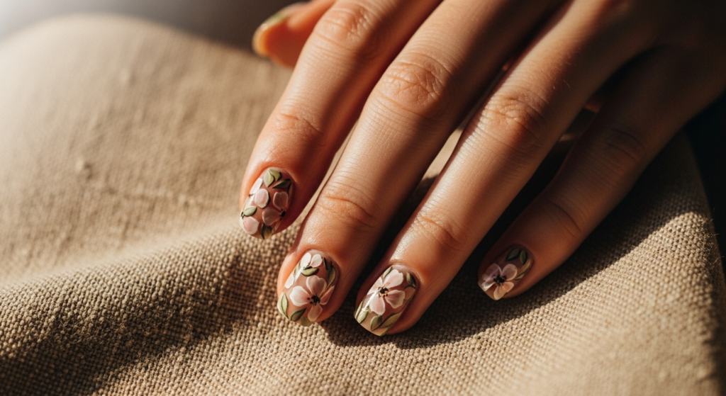 Use a nude or sheer base with small hand-painted flowers. Balance detail with negative space for a refined finish.