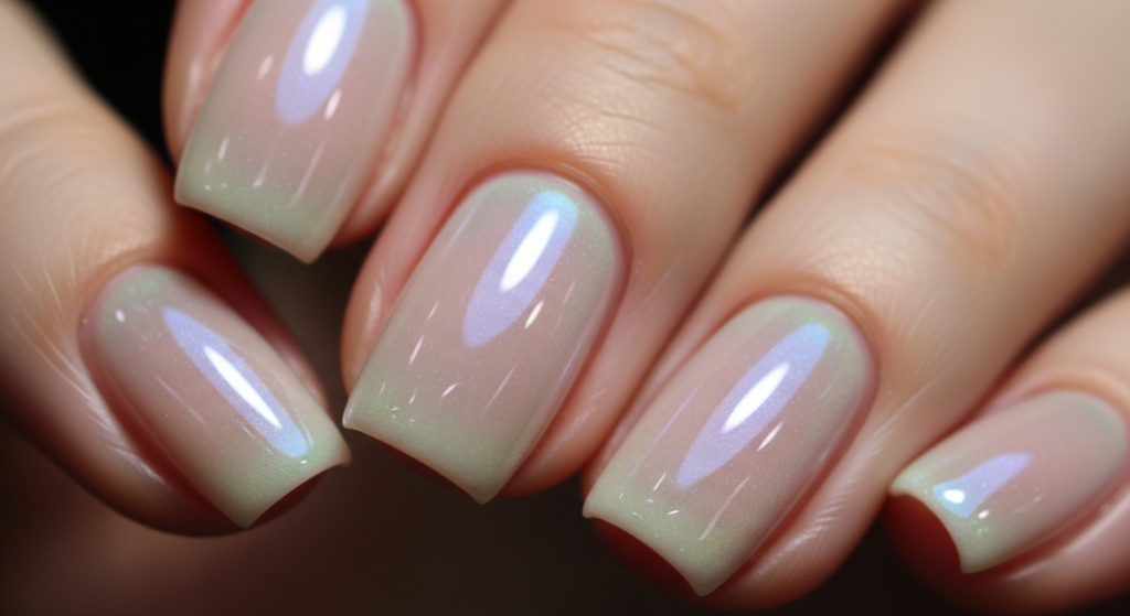 Inspired by the “glazed donut” trend, these nails feature a pearlescent sheen that reflects light beautifully.