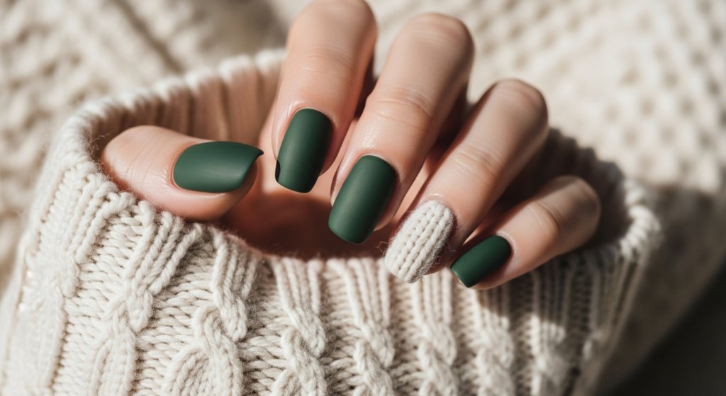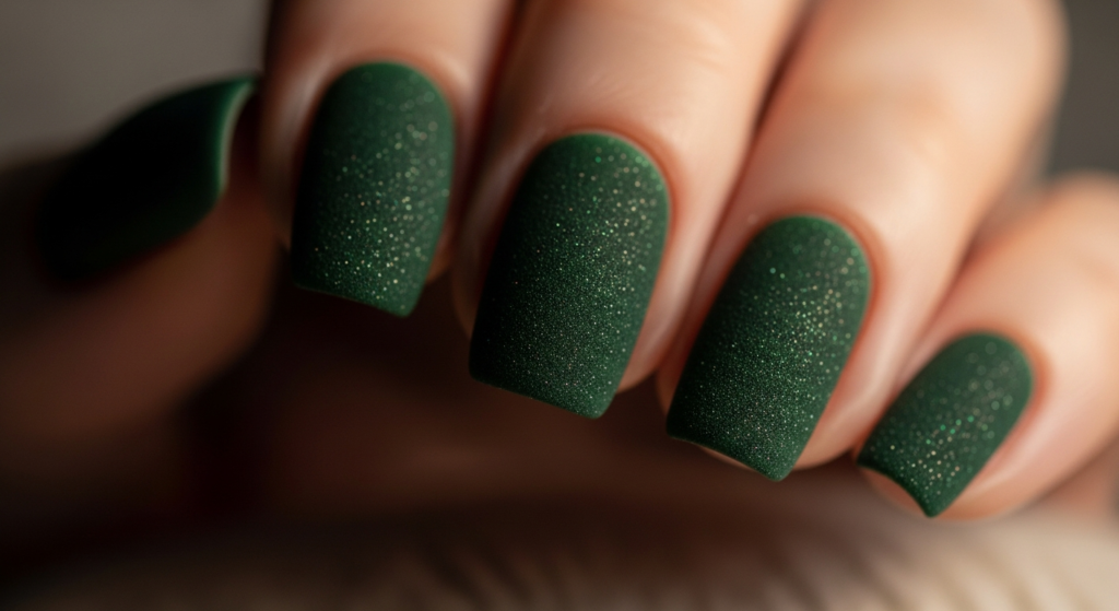 Matte finishes bring a soft, velvety texture to dark green nails, making them feel modern and understated.