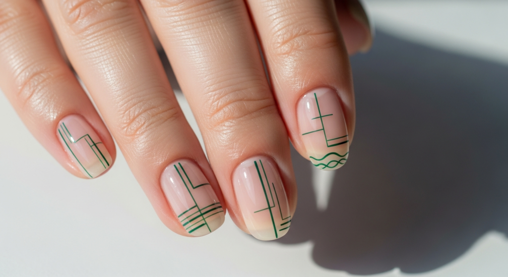 Fine green lines over a nude base create a clean, contemporary design.