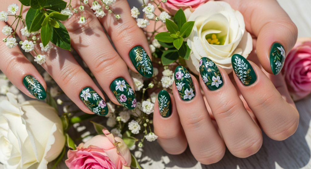 11. Dark Green Floral Nail Art