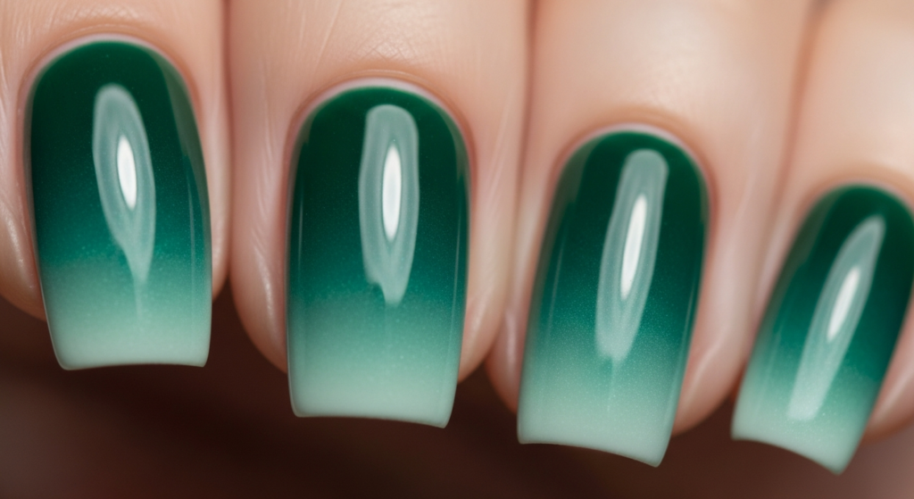 A gradient from deep green to lighter shades or nude creates a soft, blended look.
