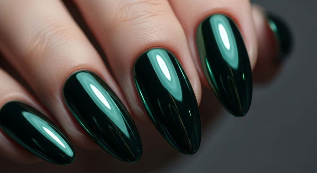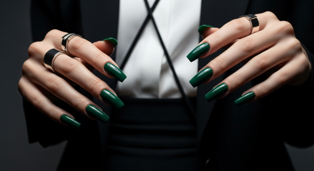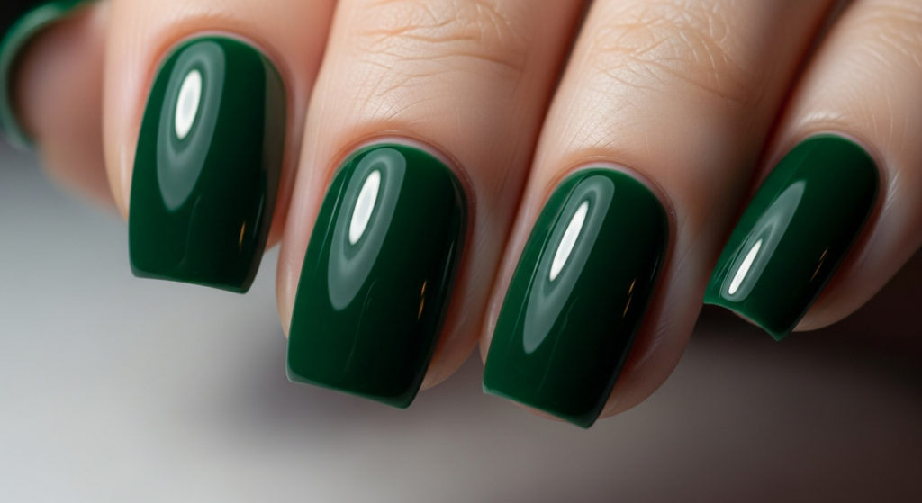A rich, glossy dark green manicure delivers a polished and timeless look that never feels outdated.