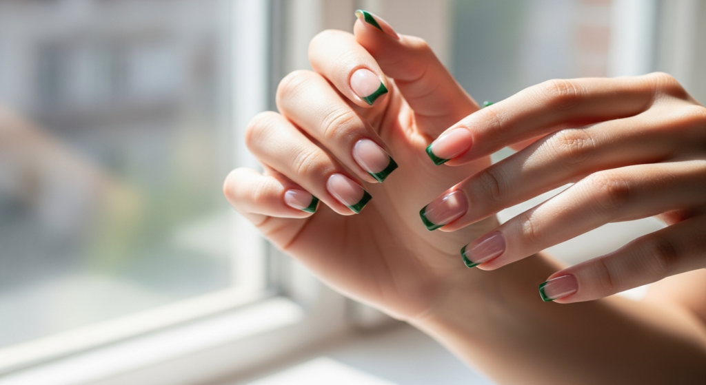 A modern twist on a classic French manicure, using dark green for the tips adds depth and sophistication.