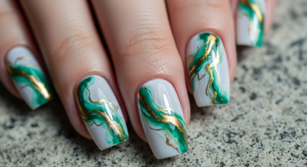 Swirls of green mixed with white, black, or gold create a marble effect that feels artistic and luxurious.