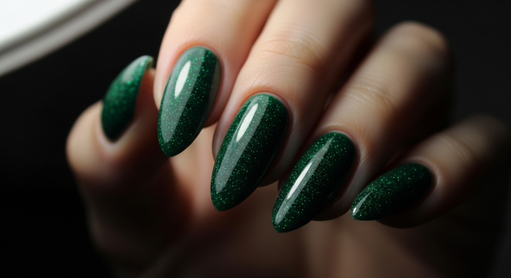 A touch of glitter adds sparkle while maintaining the richness of the dark green base.