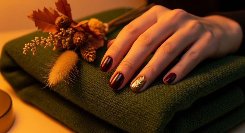 Styling Tip: Build an autumn or winter nail look around a rich, warm base — deep burgundy, forest green, warm terracotta, or dark chocolate — and add a single accent nail in a complementary metallic or texture. A burgundy base with a deep gold leaf accent nail, a forest green base with a matte olive accent, or a terracotta base with a burnt orange abstract swirl all create beautifully seasonal looks with genuine design sophistication. Vary the finish — glossy on plain nails, matte on the accent — for additional dimensional interest.