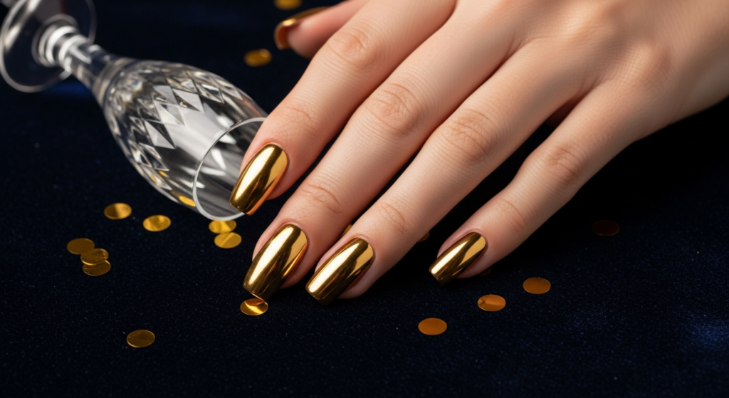 Styling Tip: For a celebration party nail look that is glamorous but never garish, try a full chrome or metallic finish in champagne gold or rose gold — applied uniformly across all ten nails for a statement that is bold in effect but cohesive in execution. Alternatively, a deep black or midnight navy base with full glitter or holographic accent nails on the ring fingers of both hands creates a dramatic, editorial party look with the restraint that prevents it from becoming overwhelming.