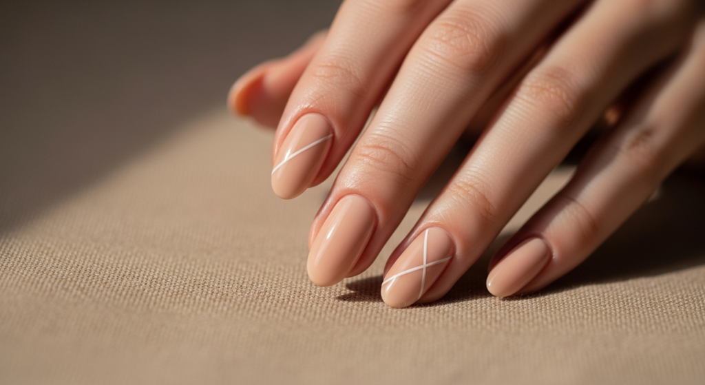 Styling Tip: Choose a warm nude or soft ivory base and ask your nail artist for a single thin line in white, gold, or a tonal shade running diagonally, vertically, or in a simple geometric form across one or two accent nails. The remaining nails stay plain in the same base colour. This asymmetric approach — art on some nails, simplicity on others — creates a sophisticated balance that feels considered rather than costumed. Keep the nail shape oval or soft almond for the most refined daily wear result.