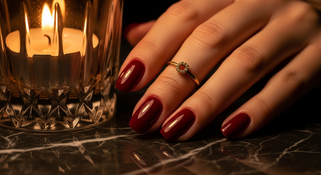 Styling Tip: For date night, choose one of three directions: a classic glossy cherry or deep wine red in a mirror-finish top coat; a deep plum or midnight navy with a chrome or metallic accent nail; or a nude glazed finish in a warmly luminous chrome that catches candlelight beautifully. All three options are deeply appropriate for an evening setting and carry the same quiet glamour that the occasion deserves. Keep the nail shape slightly longer — almond or soft stiletto — for an evening aesthetic that is unmistakably intentional.