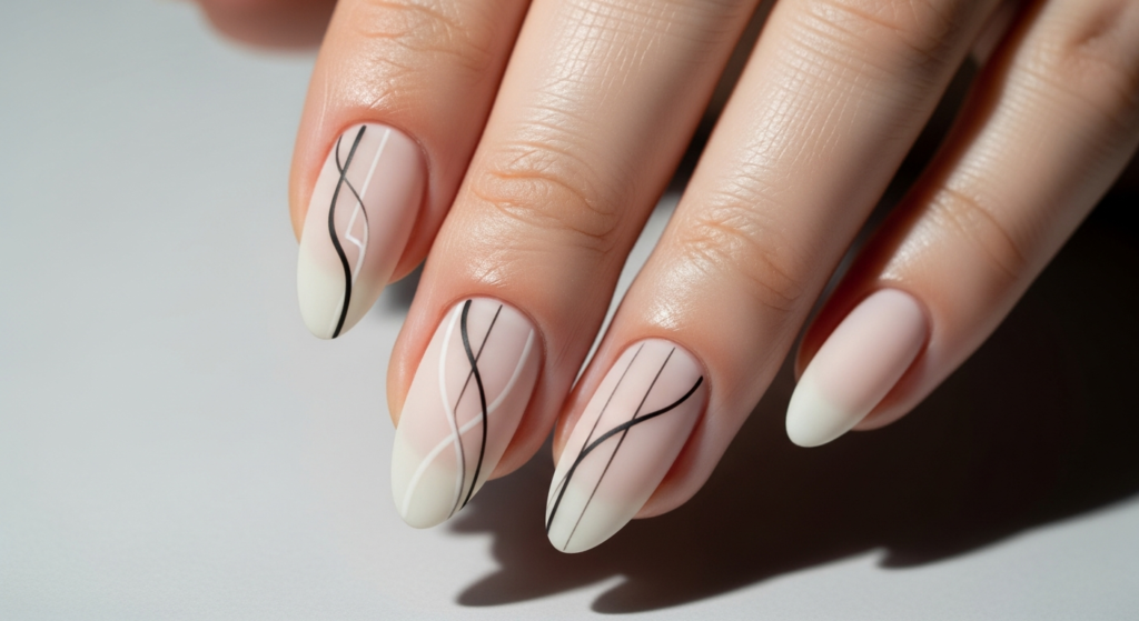 Delicate line art over neutral nails introduces a modern, artistic touch. Thin lines in black or gold create contrast without overwhelming.