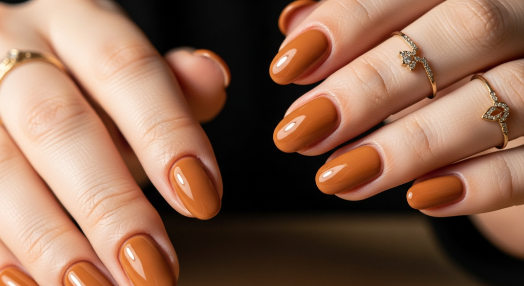 Caramel tones evoke the richness of falling leaves and soft knitwear. A glossy caramel manicure feels both comforting and polished.