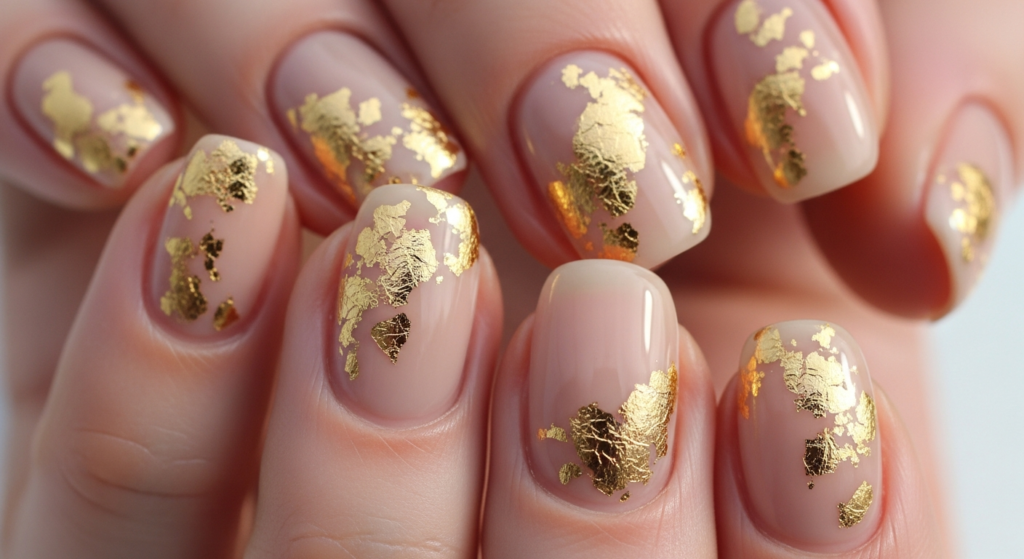 Soft nude nails act as a canvas for delicate gold foil detailing. The contrast creates a refined, luxurious effect.