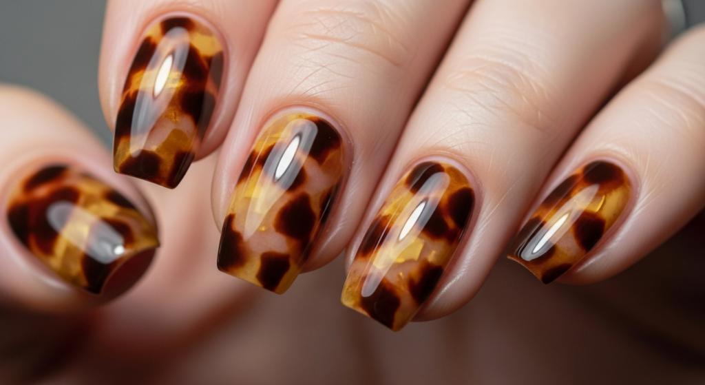 Inspired by classic accessories, tortoiseshell nails blend amber, brown, and black tones.