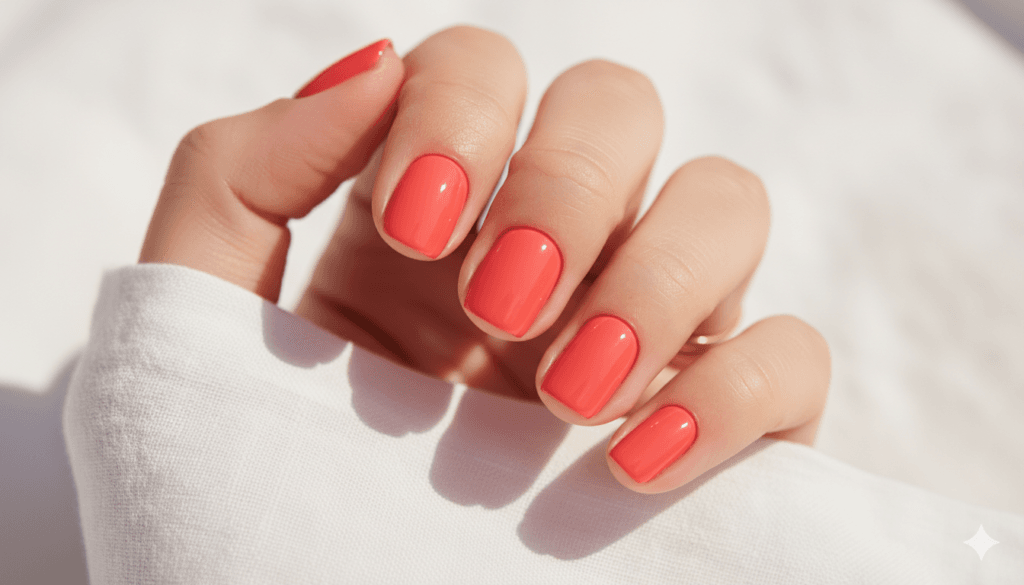 Styling Tip: Short round acrylic nails in coral photograph most beautifully in warm, natural outdoor light rather than in indoor artificial illumination — the warmth of natural sunlight amplifies the coral’s inherent warmth and creates the specific quality of colour vibrancy that makes coral nail photographs so consistently beautiful and so consistently saved on Pinterest. Apply the coral in a premium high-gloss gel formula — two thin, completely opaque coats — for a jewel-like depth and surface quality. Pair with warm gold accessories and warm-toned summer wardrobe pieces in white linen, cream, or warm tan for the most colour-cohesive and the most specifically beautiful overall aesthetic.