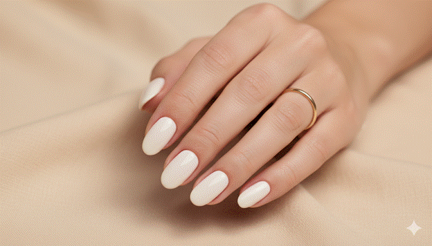 Styling Tip: Milk white acrylics look most beautiful when the finish is impeccably smooth — any surface irregularity, brush mark, or application unevenness is maximally visible against a white surface, making the quality of the top coat application the most critical factor in the design’s final elegance. Apply a self-levelling high-gloss top coat generously and allow to fully self-level before curing — this single application decision creates the difference between a white acrylic that looks freshly applied and beautiful and one that shows every mark of its construction. Pair milk white short oval acrylics with warm gold accessories exclusively — silver or cool-toned metals create a slightly clinical contrast with the milk white that disrupts its warmth.