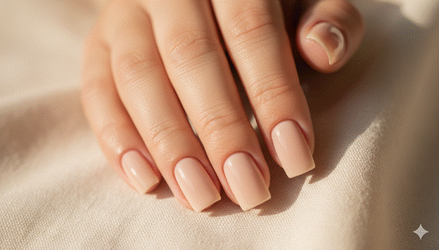 The acrylic substrate provides the most consistent and the most precisely maintainable square shape available — the material’s hardness and its resistance to the lateral stress that causes natural nails to break at sharp corners makes the short square acrylic particularly well-suited to this demanding shape. The glazed nude finish over this precise square creates a nail of complete, composed authority.