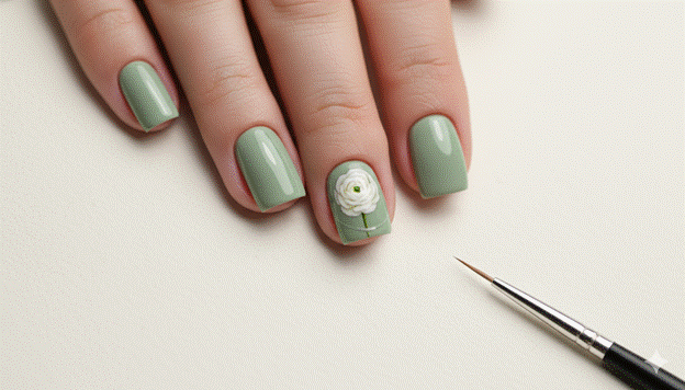 Styling Tip: The most beautiful minimalist floral short square acrylic uses a base colour drawn from the flower’s own palette — a soft sage green base beneath white and pale pink cherry blossoms; a warm dusty rose base beneath tiny white chamomile flowers; a sheer nude base beneath a single delicate yellow ranunculus — creating a colour relationship between the background and the botanical detail that feels designed rather than simply placed. Apply the floral art to the ring finger only, keeping all remaining nails in the clean base colour, for the most editorial and the most compositionally considered short acrylic nail art result.