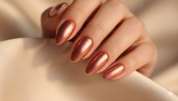 Styling Tip: A short almond acrylic in rose gold chrome achieves its most beautiful result when the acrylic extension at the free edge is the absolute minimum required to achieve the taper — even 1-2mm of additional free edge beyond the natural nail’s length creates the characteristic almond taper without adding the length that would make the design less practical. Ask for a ‘micro almond’ shape that applies the almond taper to the absolute minimum added length. The rose gold chrome applied over a warm champagne or blush pink gel base creates the most specifically beautiful and the most warmly feminine chrome result on the short almond acrylic shape.