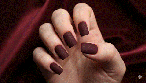 Styling Tip: The most beautiful deep burgundy matte short square acrylic requires the cuticle zone to be absolutely clean — any burgundy gel that has made contact with the skin around the nail must be removed with a fine angled brush dipped in acetone before curing, because the deep, saturated colour makes any cuticle flooding immediately and very visibly apparent in a matte finish. A single coat of the matte top coat applied in a single stroke without overworking creates the most uniformly velvety surface quality. Pair with warm gold ring jewellery — the warm gold against the deep burgundy matte creates one of the most specifically beautiful and most consistently flattering jewellery and nail combinations available.