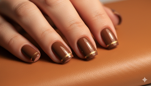 The mocha base creates a nail of warm, grounded, contemporary beauty that coordinates with the broadest possible range of wardrobe tones and accessory choices. The gold detail — a fine accent line, a small foil fragment at the corner, or a thin gold French tip — adds the one note of deliberate luxury that elevates the warm mocha from a simply beautiful neutral into a specifically considered and specifically beautiful nail design.