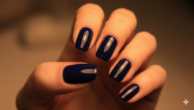 The high-gloss finish on midnight navy creates a nail surface that catches and holds the warm amber quality of candlelight and dim interior illumination with a specific, deeply beautiful quality — the dark, glossy surface appears almost lacquered, reflecting warm pools of light across its curved surface in a way that creates a nail of continuous, shifting visual interest throughout an evening occasion.