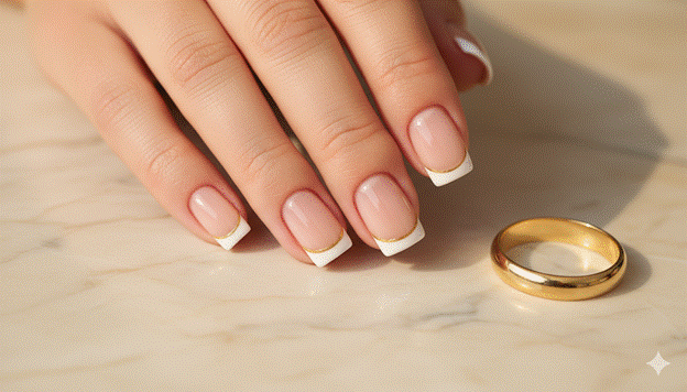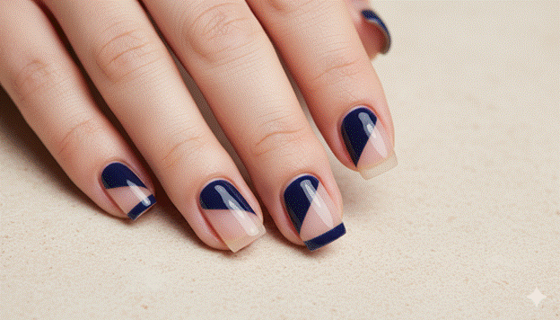 Styling Tip: Nail tape applied precisely in the desired geometric position is the most reliable technique for achieving clean negative space lines on short acrylic nails. On a short nail canvas, the geometric relationship between the coloured and the clear zones must be particularly precisely executed — any slight asymmetry or tape-line imprecision is more immediately visible at short nail lengths than at longer ones where the eye has more surface area to process simultaneously. Clean the tape boundary with a fine acetone brush before curing to remove any gel bleeding under the tape edge. Remove the tape immediately while the gel is uncured and clean any residual gel with the acetone brush for the sharpest possible negative space line.