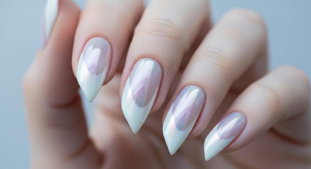 Styling Tip: Aurora shrimp nails require a white or very pale base — the lighter the base, the more complete and the more vivid the colour shift visible across the curved nail surface. The arc of the shrimp shape is particularly beautiful for the aurora effect because the curve creates natural variations in the angle of the nail surface, allowing multiple colour shifts to be visible simultaneously across a single nail. Apply the aurora powder with a gentle circular buffing motion and seal with a gloss top coat that does not diminish the multichrome quality.