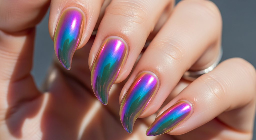 Aurora multichrome on a shrimp nail shape is one of the most visually extraordinary nail looks available — the colour-shifting iridescent finish moves through pink, purple, blue, and green across the curved surface of the shrimp nail, creating an endlessly dynamic and genuinely breathtaking display that changes completely with every angle, every light source, and every movement.