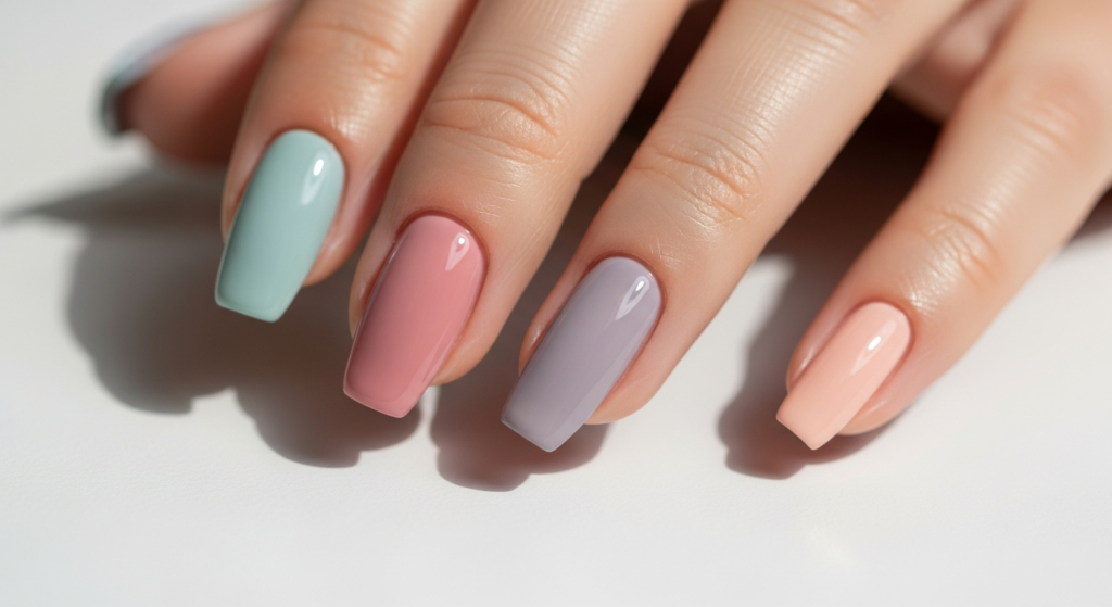 A different soft pastel on each nail of a shrimp nail set — pale blue, soft mint, dusty rose, muted lavender, and barely-there peach — creates one of the most joyfully beautiful and most uniquely wearable shrimp nail looks of 2025. The distinctive curved shape unifies the varied pastel palette across all ten nails with the consistency of its signature silhouette.