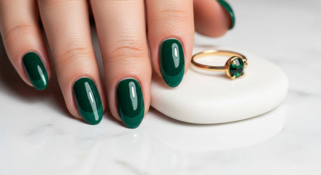Styling Tip: Choose a forest green with genuine depth and richness — dark enough to create significant visual impact, warm enough to avoid reading as cold or stark. A high-gloss finish brings out the jewel-like quality of forest green most powerfully on the curved shrimp surface — the arc catches and reflects the gloss from multiple angles, creating a beautiful dimensional depth. A matte finish on forest green shrimp nails creates a more organic, editorial result with a beautifully dusty, botanical quality. Gold jewellery is the ideal companion to forest green shrimp nails — the warm metal amplifies the richness of the dark green with beautiful contrasting warmth.