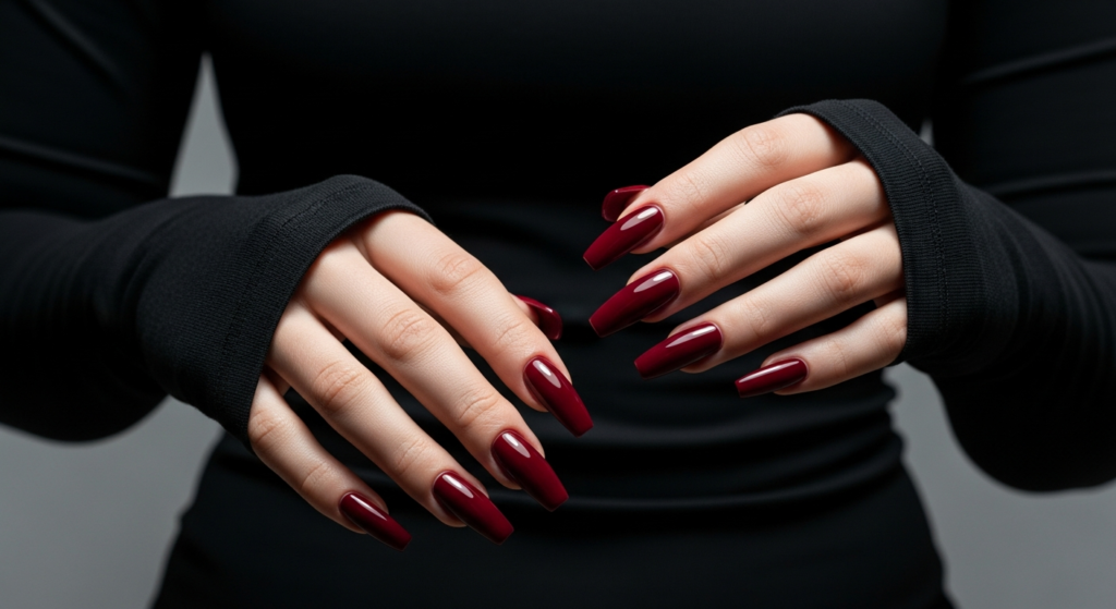 Coffin-shaped nails in a deep maroon shade feel bold, edgy, and fashion-forward.