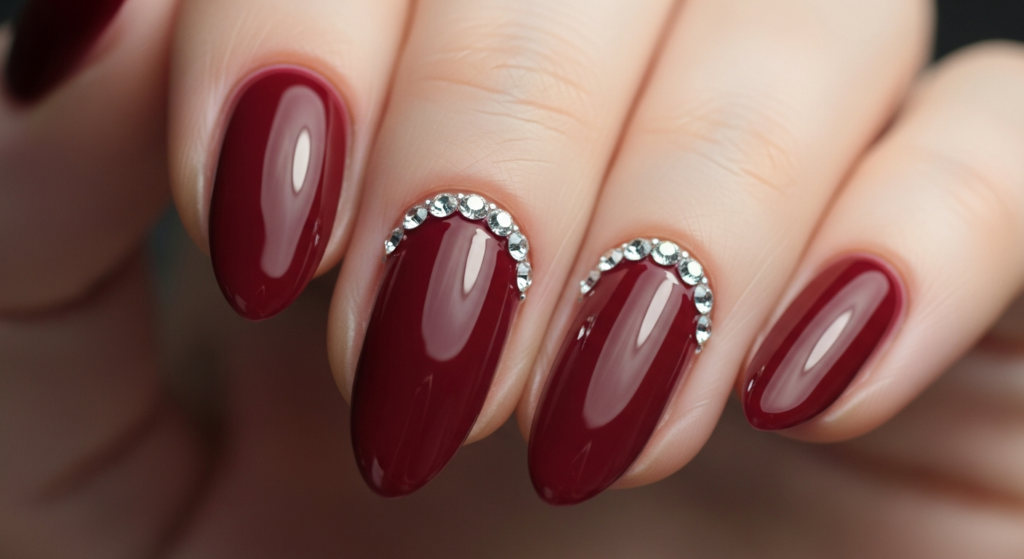 A touch of rhinestones adds sparkle and glamour, making maroon nails feel red-carpet ready.