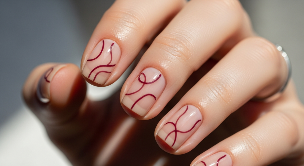 Fine maroon lines over a nude or clear base create a sleek, minimalist design.