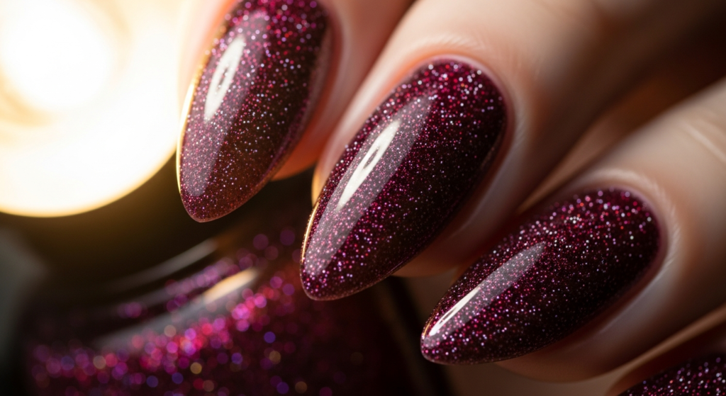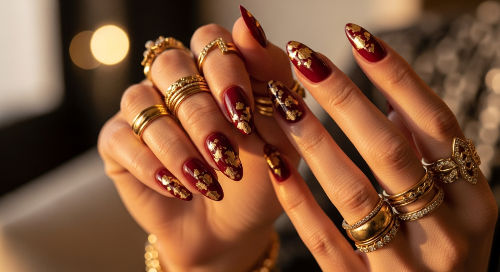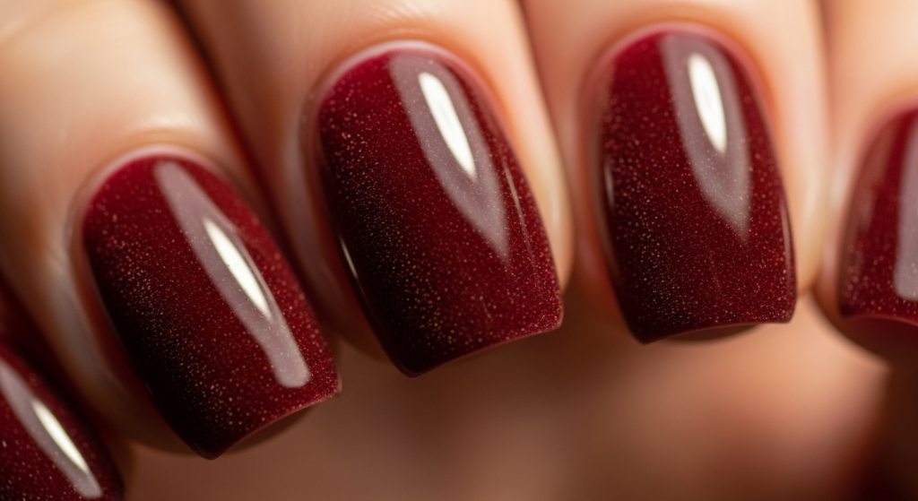 Subtle shimmer or full glitter maroon nails bring a festive sparkle without overwhelming the look.