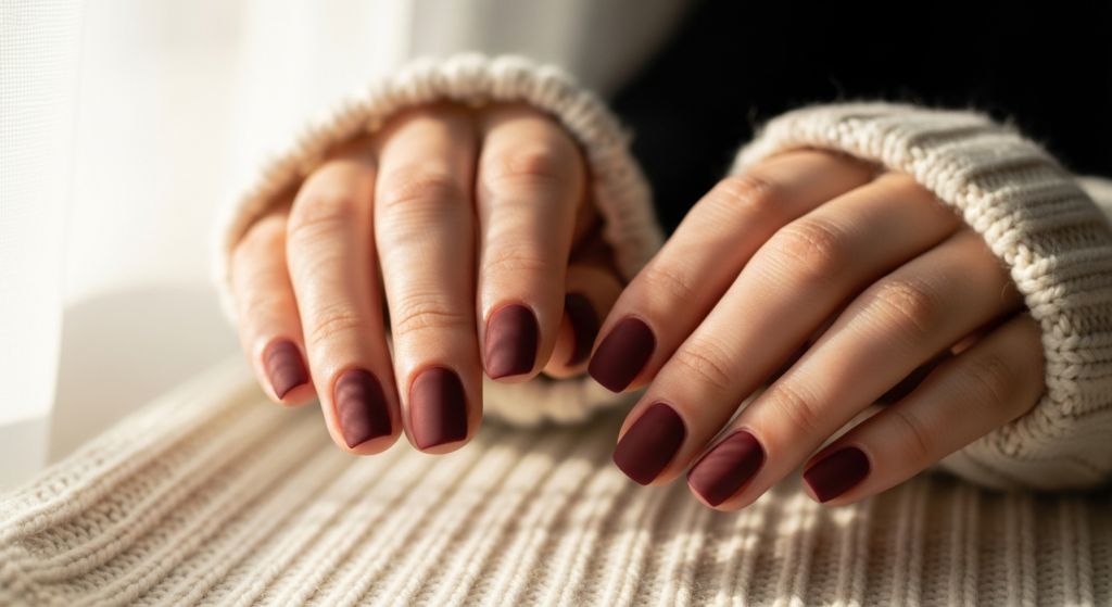 Matte maroon nails offer a velvety, modern twist. The lack of shine adds depth and a contemporary feel.