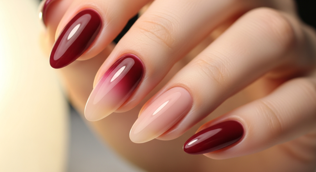 A gradient blend from deep maroon to a lighter shade (like blush or nude) creates a soft, dreamy transition.