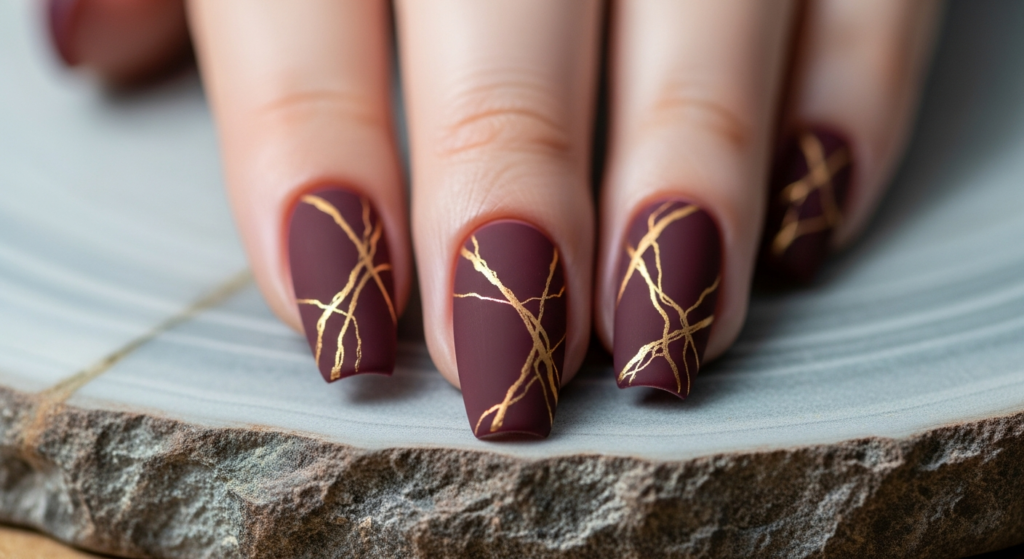 Maroon marble nails blend swirls of white, black, or gold to create an artistic, stone-like effect.