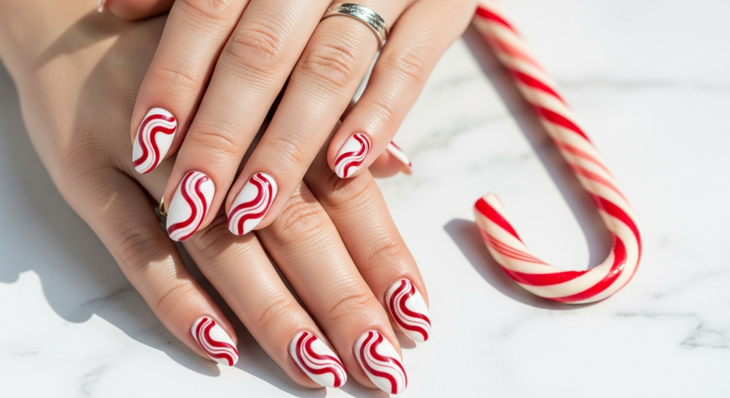 9. Candy Cane Swirl Nails — Playful, Modern, and Deeply Seasonal