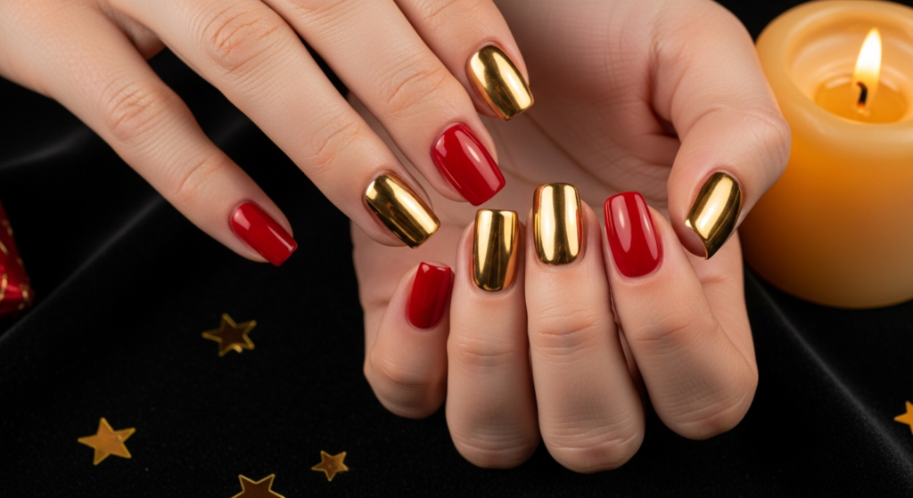 - The most beautiful red-and-gold xmas nail art approaches include: deep red nails with gold fine-line detail on accent nails; alternating deep red and gold chrome nails across the ten fingers; a deep red base with gold leaf flake applied at the tip; or a solid deep red base with a single thin gold stripe at the nail’s curvature.