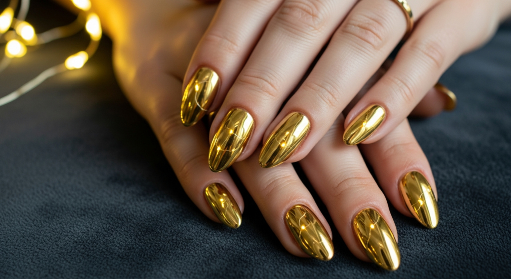 2. Gold Chrome Holiday Nails — Festive Luxury at Its Most Luminous