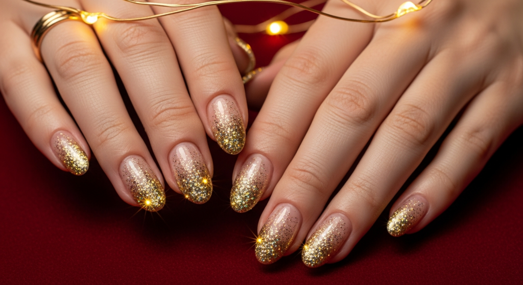 - For the most viral and the most universally beautiful xmas nail ombre effect, use a fine holographic gold or champagne glitter rather than chunky particled glitter — the finer the glitter, the more luminous and the more wearable the final result.