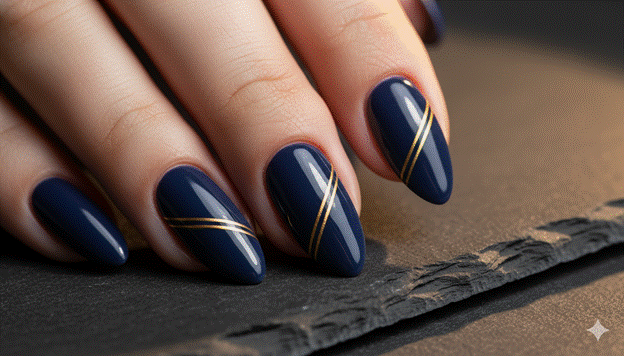 A single diagonal gold line across a deep navy nail; a hairline of gold at the free edge of a sheer nude base; a fine horizontal gold stripe at the mid-nail point of a clean white gel — each of these configurations uses the same element — one thin gold line — to create a completely different elegant nail aesthetic. The common quality is the deliberateness of the line: its clean, confident application, its precise placement, and the quality of gold it communicates.