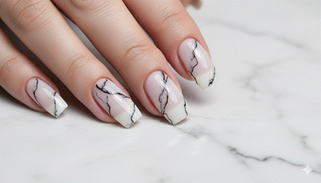 Styling Tip: Create the most convincing and most elegant marble nail veining using a fine nail art liner brush or a thin nail art detail brush loaded with a thin, well-diluted black or grey nail art gel. Draw the primary vein line in a single, slightly curved stroke from one edge of the nail to the other, then add thinner branch lines extending from the primary vein in a organic, slightly irregular pattern. The key to convincing marble nail art is the irregularity of the line — a perfectly straight or perfectly even vein reads as painted rather than geological. Vary the pressure on the brush slightly throughout each stroke to create the characteristic natural variation in vein thickness.