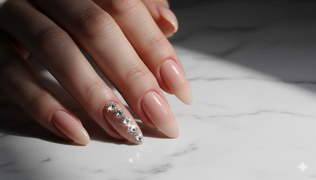 A crystal or rhinestone accent nail — a single nail in the set ornamented with a carefully designed arrangement of fine-quality nail crystals — is the elegant nail design that most directly and most convincingly references the language of fine jewellery. The ring finger nail, traditionally the most ornamented in any nail art context, becomes a small, wearable jewel — a precious object that catches light with every movement of the hand.